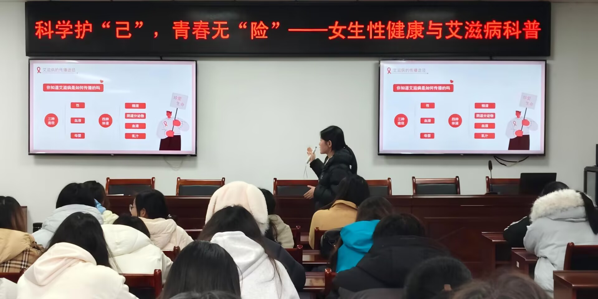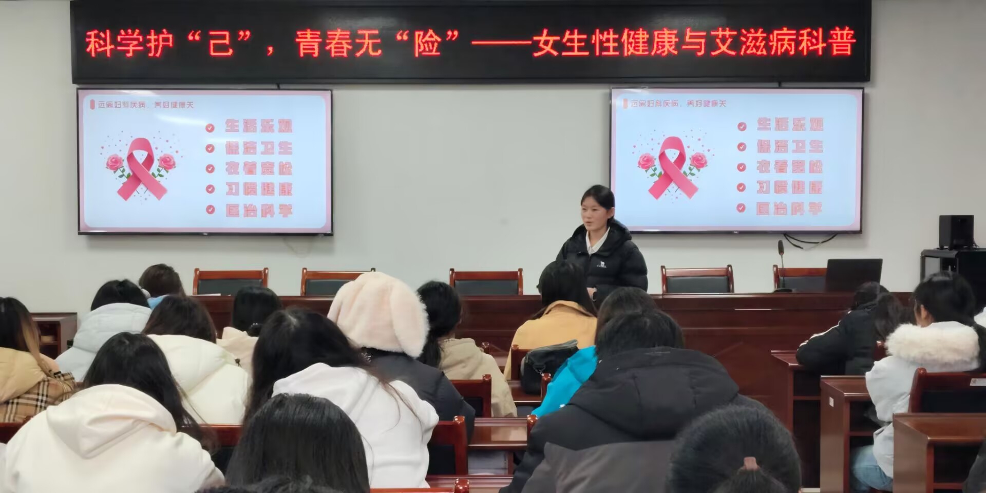 讲座伊始,主讲人以一组触目惊心的艾滋病数据开篇,通过全球及我国艾滋病感染现状、青年学生感染案例,以及女性人工流产相关数据,揭示了校园恋爱中潜藏的健康风险,突显了性健康知识普及的紧迫性。随后,主讲人围绕三大核心板块展开讲解:在女性生殖健康小常识部分,详细阐释了生殖系统各部位功能及日常护理要点;在艾滋病及性传播感染知识板块,科普了病毒特性、传播途径和女性艾滋病性传播现状;最后在女性守护指南中,澄清了怀孕与避孕相关的认知误区并给出科学处理方式,提出了谨慎交友、明确恋爱边界、定期进行生殖健康筛查等针对性建议。整场讲座,主讲人结合生物科学专业知识层层递进,围绕私处护理、艾滋病防护、校园恋爱边界等热点问题展开交流,在场学生积极回应,现场学习氛围浓厚。