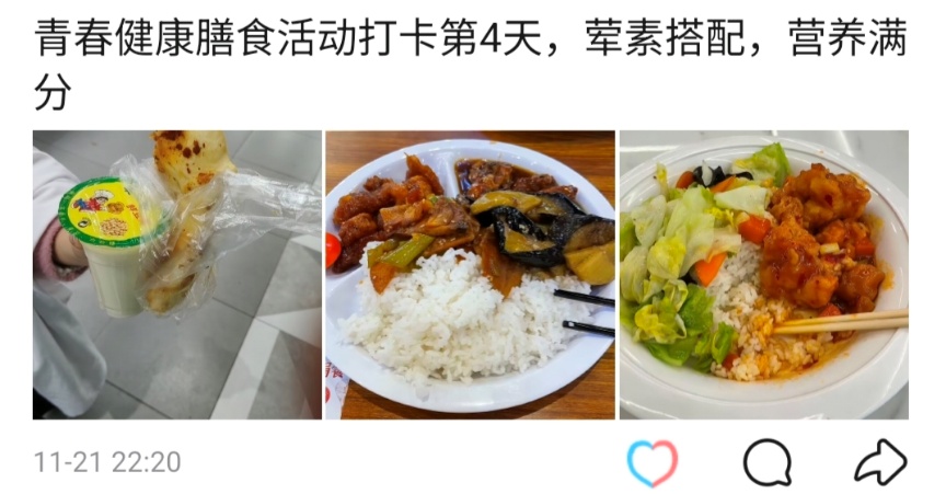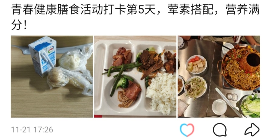 作为面向全校的健康膳食实践载体,活动以“普及科学饮食知识、培养均衡膳食习惯”为核心,引导学子主动规划每日膳食、掌握食材搭配技巧。打卡中,杂粮主食配清炒时蔬、清蒸蛋白搭新鲜果蔬等创意搭配频现,不仅纠正了挑食偏食等不良习惯,更让“荤素均衡”理念深入全校师生心中。