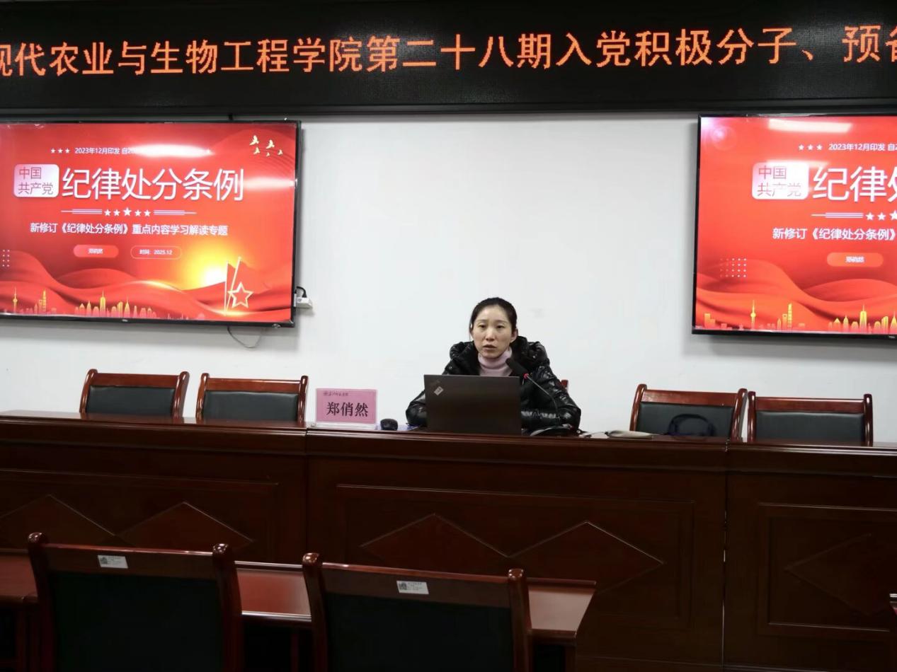 为深入学习贯彻2023年新修订《中国共产党纪律处分条例》(以下简称《条例》),加强青年党员及入党积极分子的纪律建设与党性修养,2025年12月4日中午,学院党委副书记郑俏然主持开展专题培训,以《条例》解读为核心,为学员们带来一堂内涵深刻、指导性强的党性教育课。