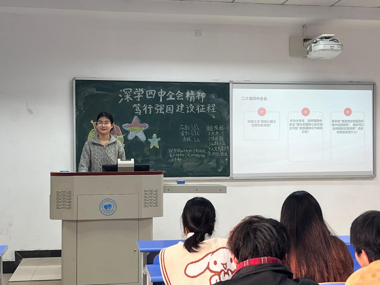 团会上,纪委完成考勤点名,随后齐唱团歌。各班主讲人围绕党的二十届四中全会精神核心内容,通过PPT展开宣讲,带领同学们深入领会关于强国建设的战略部署,剖析了青年在新征程中的责任与使命。