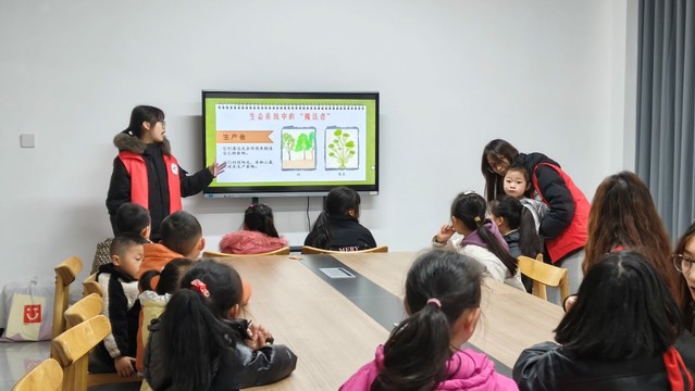 活动中,志愿者结合小朋友认知特点,将“生态系统”“食物链”等抽象概念转化为通俗表达。通过“小草被兔子吃,兔子被老鹰抓”的生动案例引出“谁吃谁”的趣味提问,瞬间点燃孩子们的参与热情。面对孩子们不同的疑问,志愿者们通过图片耐心解答,引导小朋友们清晰区分生产者、消费者和分解者的角色。