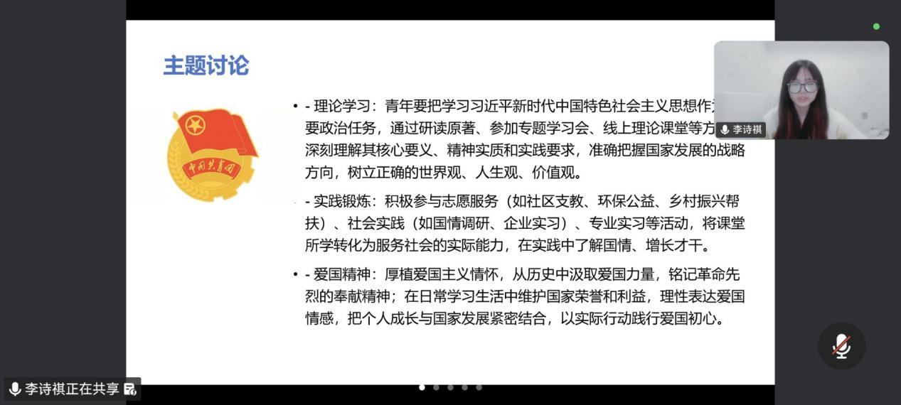 会上,各班主讲人通过PPT展开深入宣讲,并引导团员们结合团会主题和新时代新形势,围绕“中国式现代化”、“什么是青年”等关键词展开深入学习和研讨,将个人学业发展与国家民族命运紧密相连。