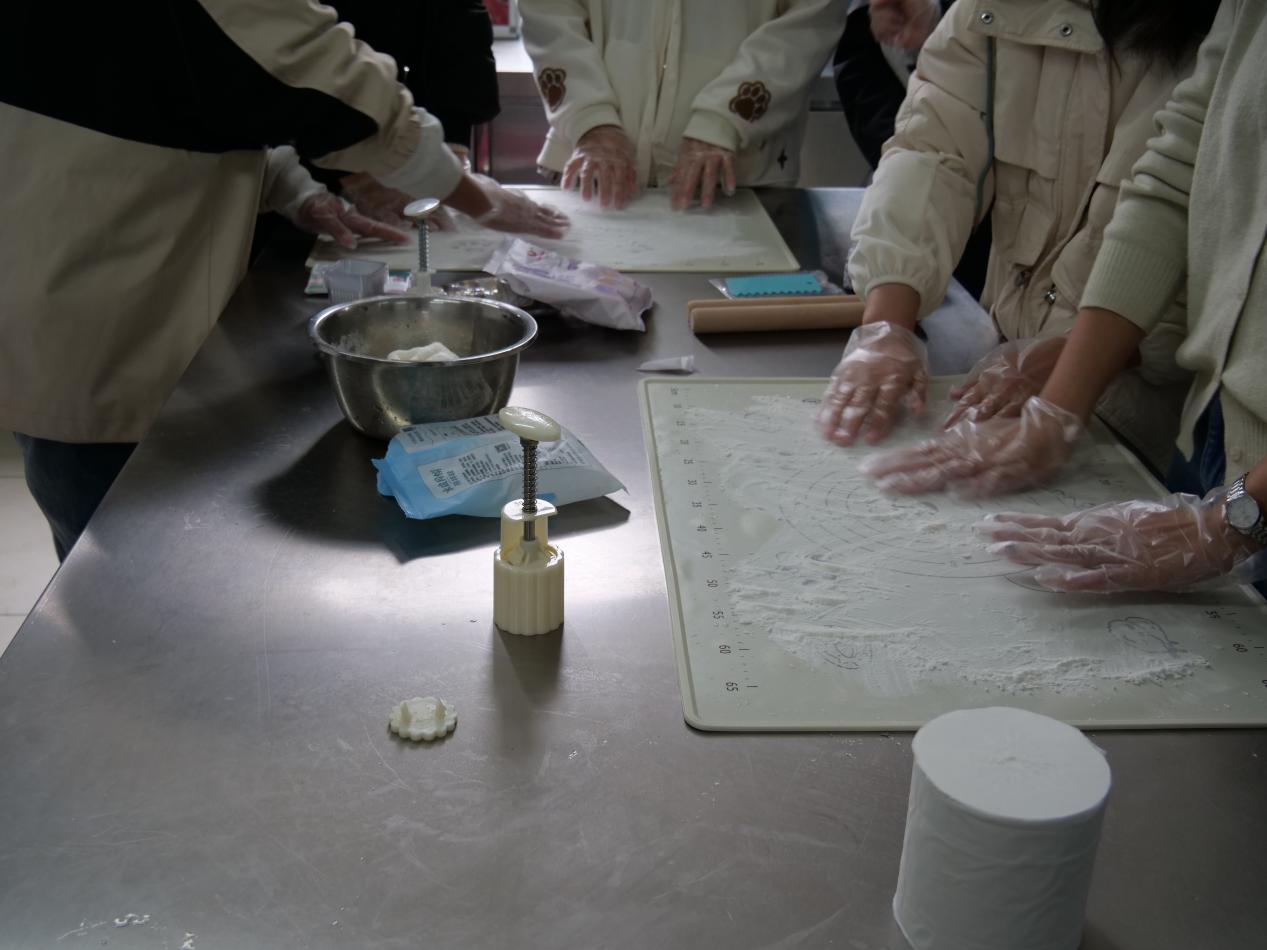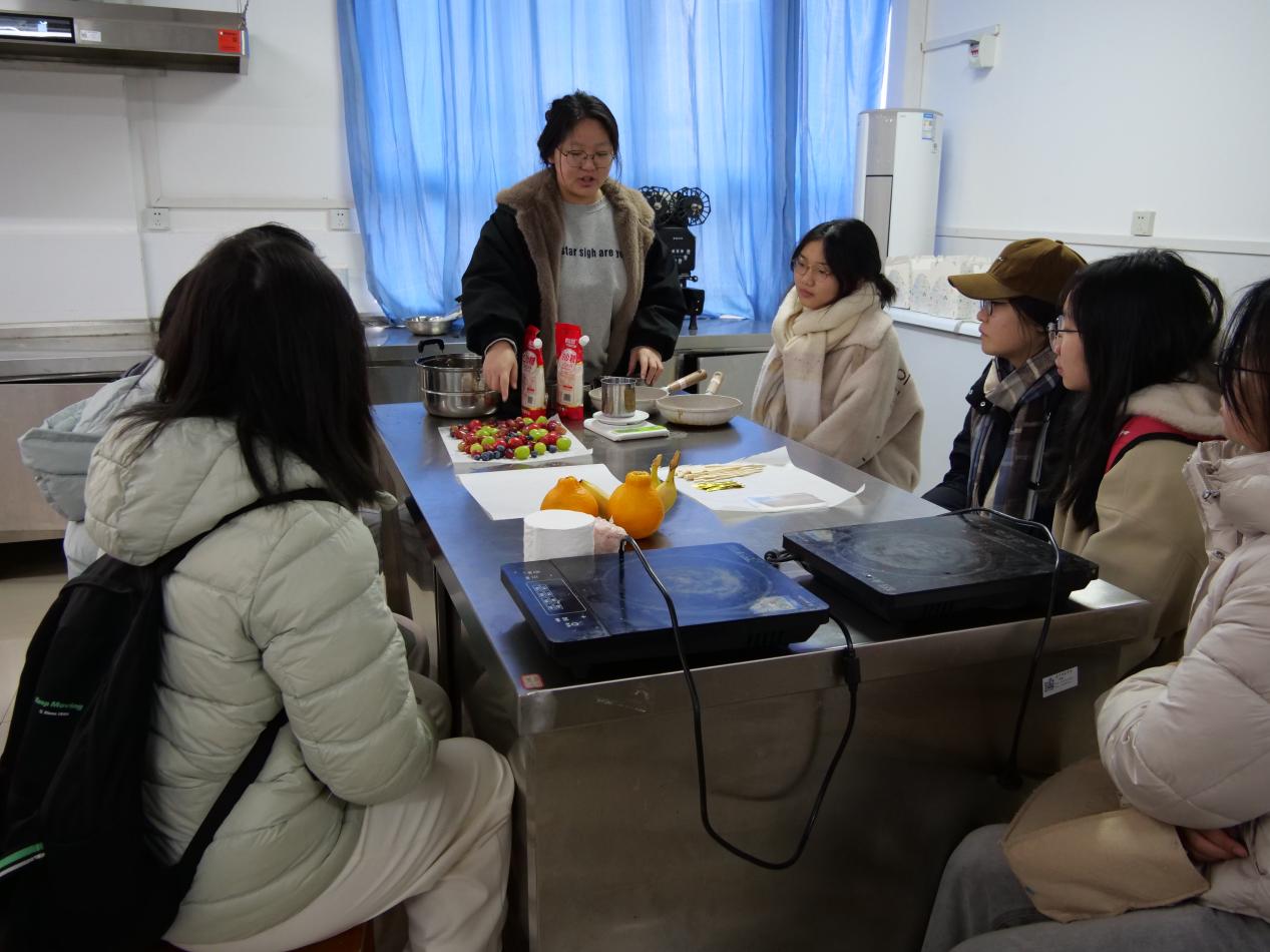 上午10点,活动正式拉开帷幕。活动现场暖意融融,同学们分组协作,有条不紊地投入到暖冬食品制作中。清洗水果、熬制糖稀、串制糖葫芦,称量原料、打发奶油、烘烤小蛋糕,揉制冰皮、包入馅料、压制成型……大家各司其职,在实践中感受动手创作的乐趣。当晶莹剔透的糖衣裹住酸甜的山楂,蓬松绵软的蛋糕散发诱人香气,软糯精致的冰皮月饼摆满桌面,实验室里充满了同学们的欢声笑语。