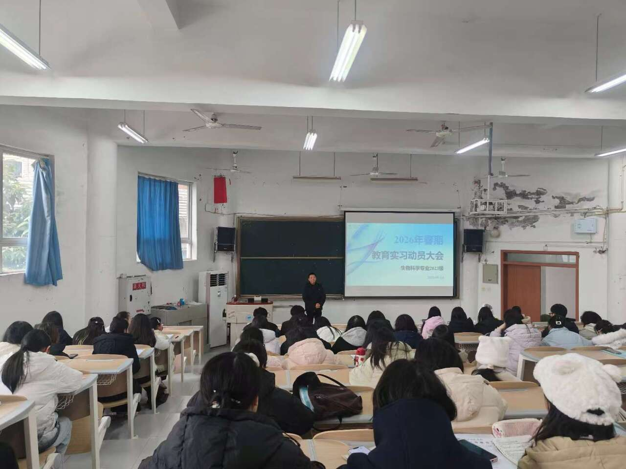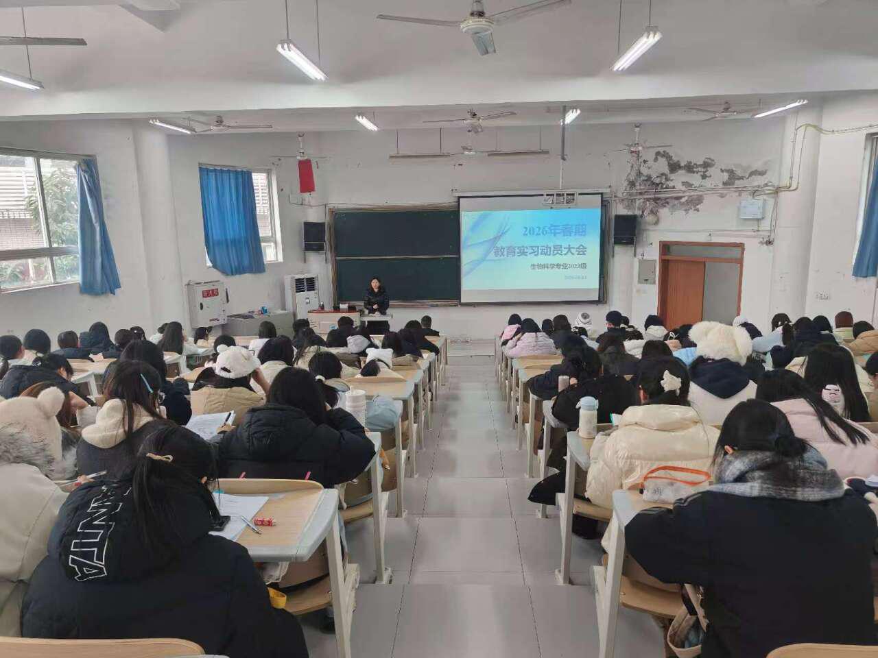 为落实《长江师范学院关于做好2026年春期教育实习工作的通知》精神,扎实推进我院2023级生物科学专业2026年春期教育实习工作,学院于2026年1月14日下午在格04教室召开了2023级生物科学专业教育实习动员会。学院教学副院长郑俏然、生物科学系教育实习课程负责人暨实习带队(指导)教师周先容老师出席会议并作动员讲话,2023级生物科学专业全体同学参会。